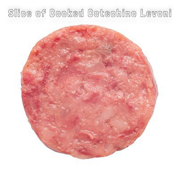 Cotechino is steamed. It shows a pink red color, a coarse and very fragrant "collagenous" paste. It is consumed hot, and is characterised by the texture of soft and sticky meat and by the perfect balance of spiciness.